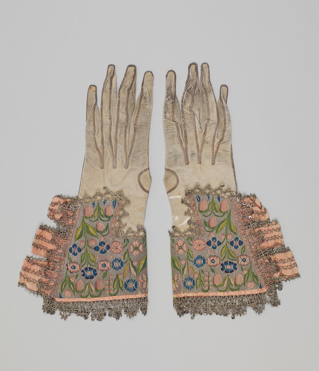 These tapestry-woven, light colored gloves, which showcase an arrangement of popular flowers—carnations, roses, harebells, pansies, and strawberry plants—were likely purchased from a shop, rather than designed for an individual. Although readymade, the gloves were still a luxury; this pair comprises pink, green, citron, and blue silks joined with salmon-colored silk ribbon, lined in taffeta, and edged with metallic bobbin lace and paillettes. They may originally have been perfumed, as well.