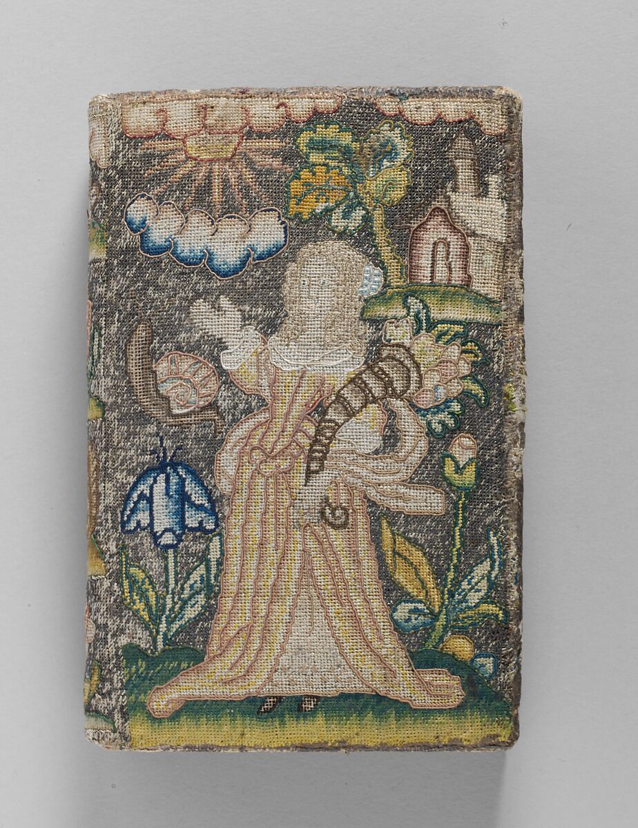 The embroidered cover of this volume has on the front the figure of a woman holding a cornucopia, probably representing Plenty; on the back is a woman holding a palm branch, presumably Peace. Plenty and Peace were likely qualities that the owner attached to monarchical rule. Embroidered references or borrowings from the Eikon Basilike include in the Victoria and Albert Museum collection an embroidered panel after the William Marshall engraving used as the frontispiece for the 1649 version of the Eikon Basilike (inv. no. T.117-1936). The frontispiece of this volume is an engraved portrait of Charles I by Wenceslaus Hollar (MMA, 17.50.85) that is derived from the double portrait of Charles and Henrietta Maria by Anthony van Dyck.