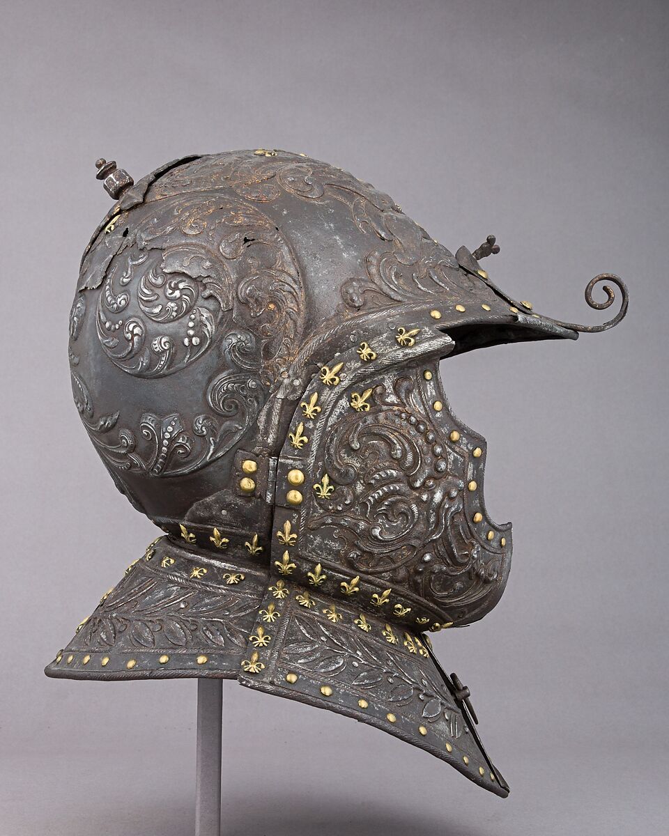 This is a rare, late example of French embossed armor. The gilt fleur-de-lis rivet heads along the edges, the fleur-de-lis plate at the apex of the bowl, and the laurel branches around the collar suggest it was made for Louis XIII of France (reigned 1610–43).