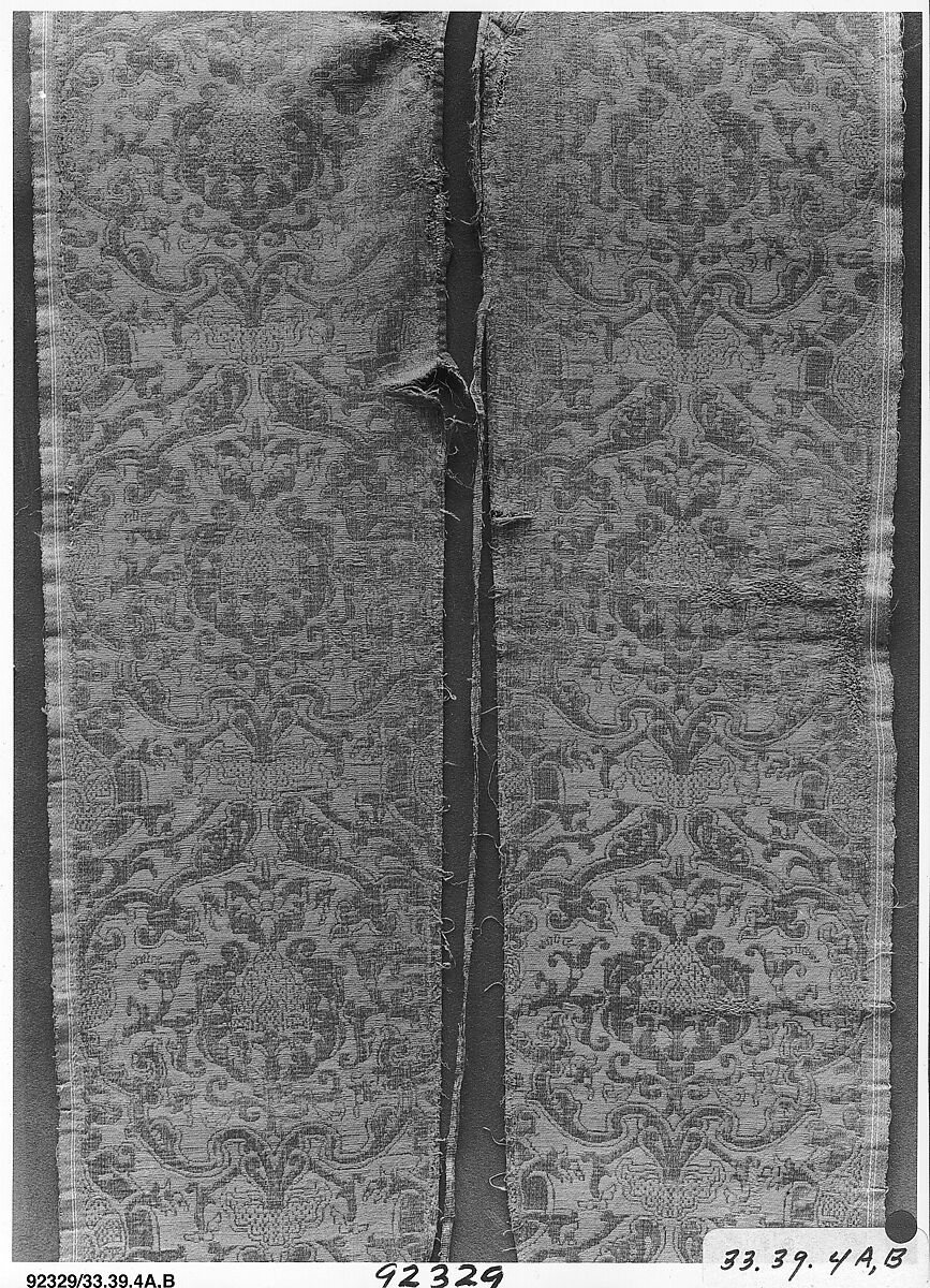 Although this object resembles the reverse of a chasuble- the tabard-like garment worn by a Catholic priest during church services- this is a modern composite of a central fragmentary orphrey strip (33.39.5) and two lengths of lampas silk (33.39.4a, .4b), assembled soon after the three elements entered The Met's collection in 1933. Most likely not originally part of the same garment, it is probable that the side panels, on the one hand, and the orphrey strip on the other, were all intended for and used as elements within two different chasubles, long ago dismembered.