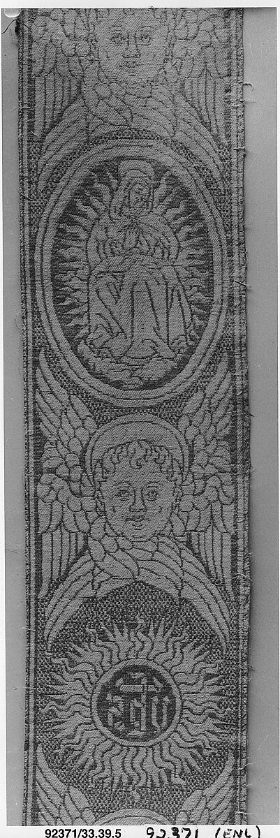 - Title: Orphrey woven with figurative repeat design of seraphim with Virgin and Child and reversed IHS Christogram in glories