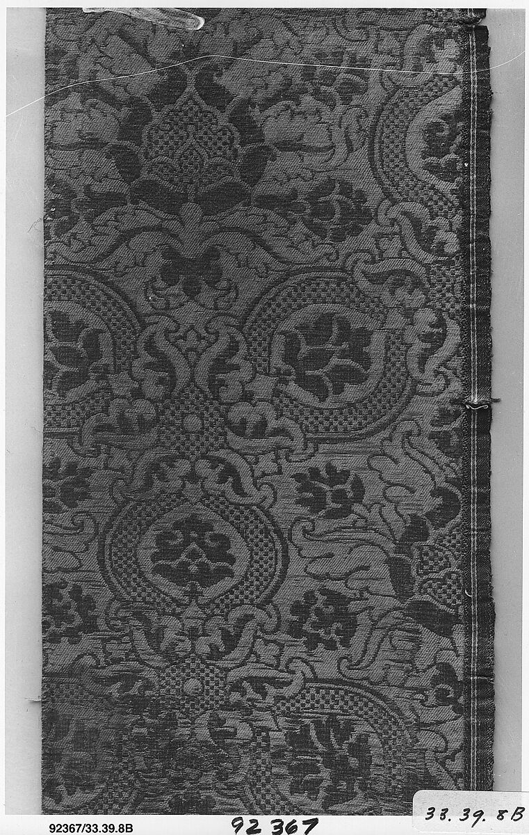Although this object resembles the reverse of a chasuble– the tabard-like garment worn by a Catholic priest during church services– this is a modern composite of two lengths of lampas silk (33.39.8a, .8b) with a central figurative woven orphrey strip (33.39.7), assembled soon after the three elements entered The Met's collection in 1933.