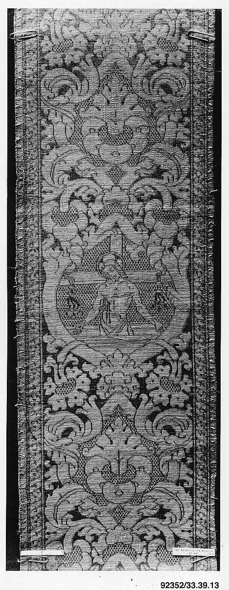 Although this object resembles the reverse of a chasuble– the tabard-like garment worn by a Catholic priest during church services– this is a modern composite of a central fragmentary woven figurative orphrey strip (33.39.13) and two lengths of lampas silk (33.39.6a, .6b), assembled soon after the three elements entered The Met's collection in 1933. Most likely not originally part of the same garment, it is possible that the side panels, on the one hand, and the central orphrey strip, on the other, were all intended for and used as elements within two different chasubles, long ago dismembered.