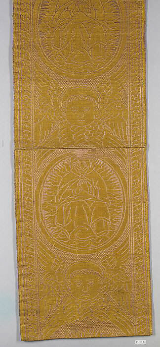 - Title: Orphrey woven with figurative repeat design of Seraphim and the Virgin and Child