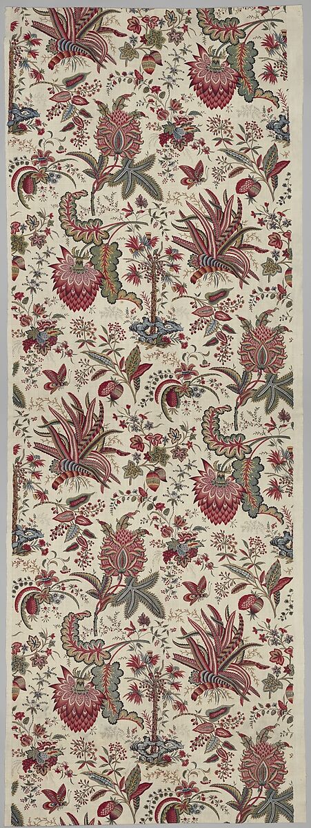 While the identity of the designer is unknown, the lush, fantastic flower heads and bold, curling leaves are clearly modeled on variations of Indian Tree of Life palampores.[4] Despite the large pattern repeat of nearly fifty inches, which might indicate that it was to be used as a furnishing fabric, this textile was most likely intended to be made into an article of clothing such as a banyan; several extant European garments from the second half of the eighteenth century are made from the same type of Indian chintz yardage that this design imitates.