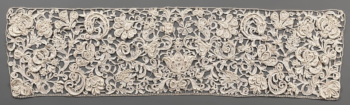 Venetian gros point needle lace, characterized by bold patterns that combined heavily padded outlines and delicate filling stitches, first became popular in the mid-seventeenth century. In late nineteenthcentury Austria, a number of lace schools were established under the patronage of Empress Elizabeth. One of these, the K. K. Zentral- Spitzenkurs, or Central Lace Exchange of Vienna, became known for its copies of Venetian gros point that incorporated partially detached elements, an innovation that augmented the threedimensional effect. This border contains elements in the style of Josef Storck, head designer at the Zentral-Spitzenkurs.