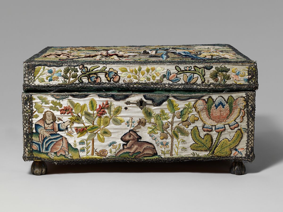 The completion of a decorated casket or cabinet would have been considered the culmination of a young woman’s education in needlework skills, and a few boxes have survived that can be firmly attributed to schoolgirls. Martha Edlin’s dated embroidered objects form the most complete record we have of one person’s output in the seventeenth century (Victoria and Albert Museum, London), although professional contributions at any point in the work would certainly have been possible. The exuberance of the decoration and the rather indiscriminate combination of materials and techniques suggest that this casket is the work of an amateur. Contrast this with the cabinet illustrating scenes from the Life of Joseph (MMA, 39.13.3a-k), which was executed in a single technique (laid and couched silk) and precisely and evenly worked on all faces of the box. This casket also lacks the consistency of theme present on most cabinets; the top of the lid shows the meeting of King Solomon and the Queen of Sheba, whereas the side panels are apparently random combinations of motifs typical of the period: heraldic animals, a castle, and a fountain, all surrounded by oversized flora and fauna. It is possible that the embroidered panels of this casket may have been applied to the wood carcass at a date significantly later than the execution of the decoration. The carcass itself is too large for the embroidered panels; the gaps where the satin foundation fabric does not cover the wood are patched with more silk and disguised with metal bobbin lace. The color and style of the lining—green silk with a padded main compartment—differ from most other boxes of the seventeenth century as well. Another casket in the Lady Lever Art Gallery collection has a similar padded interior, but the silk lining is described as the typical salmon-pink color.