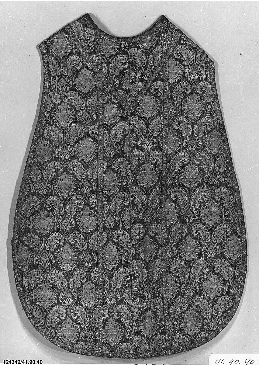 Glinting with shiny (and cheap) lamella metal thread, this red, yellow and white woven silk is thick- almost to the illusion of having a pile- thanks to several warps and wefts. What the textile lacks in terms of dexterity of execution, it gains in unusualness of design and technique. It was apparently repurposed, cut and stitched together, some one hundred and fifty-odd years after it was woven to create the current garment- a tabard-like chasuble worn by a Catholic priest over his clothes in the church. In outline, particularly its exaggerated tear-drop shaped front panel, this chasuble is typical of the nineteenth century.