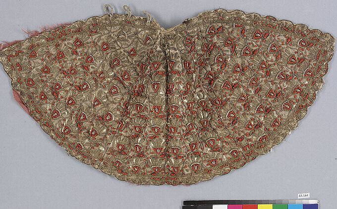 Created to adorn a cult statue, probably of the Infant Christ or of the Virgin Mary, during Catholic feast days and holy days, this distinctive cape is a rare survival of Sicilian coral work, also appreciable at The Met in the vestments 2009.300.2984a-c. With its rosy hues, coral symbolized the spilled blood of Christ whose sacrifice, Christians believe, saved Humanity; appropriate to the island of Sicily, coral was also believed to have talismanic powers, protecting its bearer when travelling on water. Here, the beads are nestled within shimmering silver threads- drawn, beaten, coiled, and wrapped around silken cores.