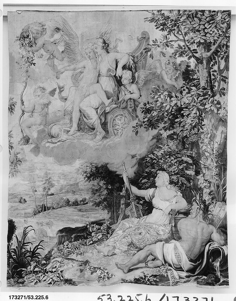 This tapestry is from a set of eight, traditionally called Les Sujets de la Fable d’après Raphaël, made for the French king, Louis XIV. The designs for all eight tapestries were inspired in part upon drawings then in Louis XIV's collection- now preserved in the Louvre- which were all, at that time, attributed to Raphael. The design source of the representation of Venus and Cupid in the chariot is a drawing in the Louvre now associated with Primaticcio; the figure of the river god is based, in reverse, on Raphael’s design recorded in his fresco of the Council of the Gods in the Villa Farnesina, Rome.