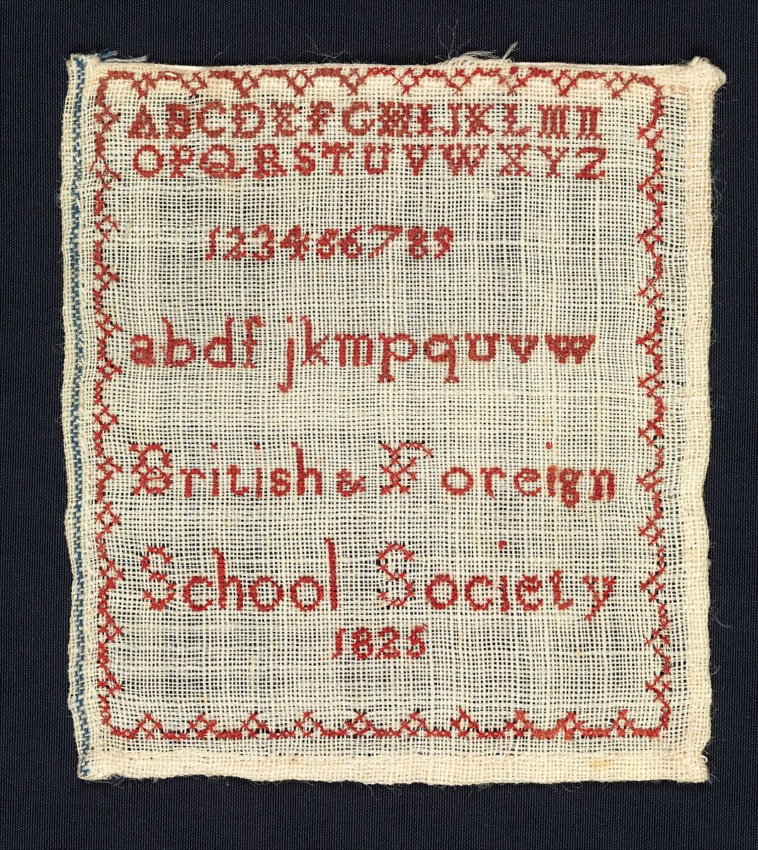 This small sampler worked with the alphabet in upper and lower case, as well as number 1 through 9, represents the tenth lesson in the "Manual of the System of Teaching Needlework in the Elementary Schools of The British and Foreign School Society," published in 1821. This educational society was founded by Quaker Joseph Lancaster (1778–1838) out of concern for the lack of educational opportunities available to poorer children, particularly those whose families not members of the Church of England. Small samplers such as this are preserved in these manuals, and were also made into objects such as pincushions that were sold to raise funds for the school. A complete example of this manual, dating from 1821, is also preserved in the Museum’s collection (accession number 43.63).