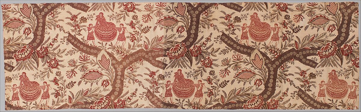 This printed fabric demonstrates the potential for textiles to serve as platforms for political and social declarations. See also MMA 26.189.2. Of probable Spanish origin, Triumfa España en las Americas depicts "America" as a Native American female upon a litter supported by two young men among stylized flora. Europeans began personifying the Americas as an exotic native woman in the sixteenth century, but the inclusion of the legend "Triumfa Espana en las Americas" suggests that the design’s authors were attempting to communicate something more explicit than the portrayal of the colonial Americas as a noble (but still inferior) savage. For most of the eighteenth century, Spanish rule in the Americas was marked by intense civil conflict across an exceptionally broad spectrum of colonial society, largely in response to the waves of colonial administrative reforms effected by the Bourbon rulers in Spain.¹ The Andean region alone witnessed more than one hundred insurrections between the 1730s and the Great Andean Rebellion of 1780 – 81 in Peru and Bolivia. Only months later, Spanish officials contended with another major uprising led by mestizos (persons of mixed descent) in the Revolt of the Comuneros (1781–82) in present-day Colombia and Venezuela. Given the violent resistance and general resentment festering in the Americas, it would not be surprising if the creator of this panel viewed it as an expression of affirmation for Spanish loyalists.