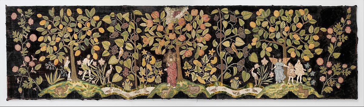 This panel was one of a set of three valances probably used to decorate the tester of a bed. Small elements—fruits, flowers, and leaves—were worked in tent stitch on canvas and then applied to the dark velvet foundation on which was worked the river in the Garden of Eden, the figures of Adam and Eve, and God the Father, in polychrome silk and metal threads. The garden is monumental, almost overwhelming the figures. The three trees that anchor the composition would have brought to mind the biblical description of trees in the Garden of Eden, the Tree of Life and the Tree of Knowledge of Good and Evil. The scene of Adam and Eve being expelled from Eden on the far right may also derive from a reading of contemporary vernacular English Bibles, rather than any pictorial convention. Adam and Eve wear garments that suggest articles of late Elizabethan dress and the Geneva Bible of 1560 referred to their first clothes as "breeches." In this and other embroidered renderings of the story of the expulsion from Eden, Adam and Eve are treated more gently by God and the expelling angel than they are in contemporary print sources.