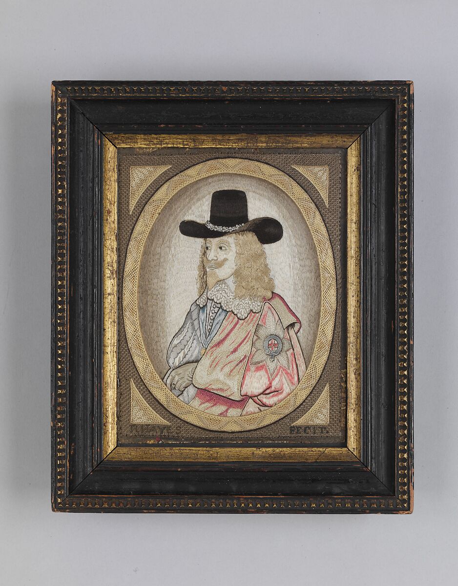 The embroidery is derived from a popular image of Charles I, which was made after his execution and exists in at least two prints: an engraving by Edward Bower, published by Robert Preeke in 1649, and an etching produced by Wenceslaus Hollar in the same year (MMA, 17.50.85). Although Yvonne Hackenbroch suggests the former as the direct print source for this embroidery, it is in fact closer to the Hollar version, in the exact transcription of the pose, in the king’s size and position relative to the oval surround, and in such details as the gloved hand and the cloak embroidered with the emblem of the Order of the Garter. John Peacock has posited that the Hollar portrait drew upon the painted portrait of Charles I Wearing the Garter Star of about 1632 by Anthony van Dyck and an "idiosyncratic" etching of Charles I by George Lid, published as a frontispiece of A Continuation of Lucan of 1630. From the former, he derived the general disposition of pose and details of costume, including the emblazoned Garter Star, and from the latter, the idea of showing the king wearing a broad-brimmed hat. That Charles wears the hat in several posthumous prints and in the embroidered portrait is a probable reference to his attire in court, when, as Hackenbroch pointed out, "Charles declined to take his hat off during the trials lest this gesture be interpreted as a sign of respect towards his Judges." In the embroidered portrait, this reference, combined with an aureole of light emanating from behind him, confers upon the image of the king both the specificity of an historical memory and an iconic aura appropriate to its commemorative function.