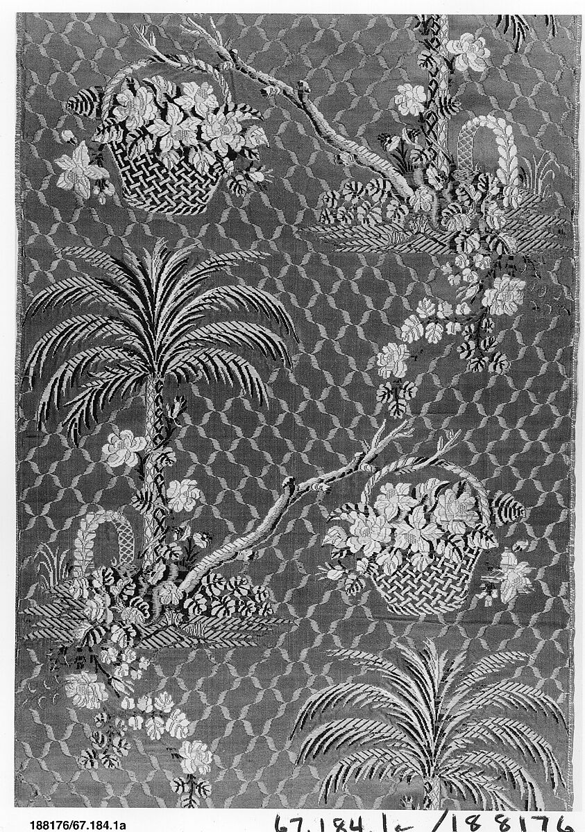 Delightfully fanciful silks were produced for the wide-skirted dresses of the eighteenth century, especially in France and England. This one, with its naïve yet striking combination of familiar and unusual motifs, does not fall into any of the established categories. Possibly it was woven in Spain, whose silk industry was revived by weavers from Lyons in the middle of the eighteenth century.