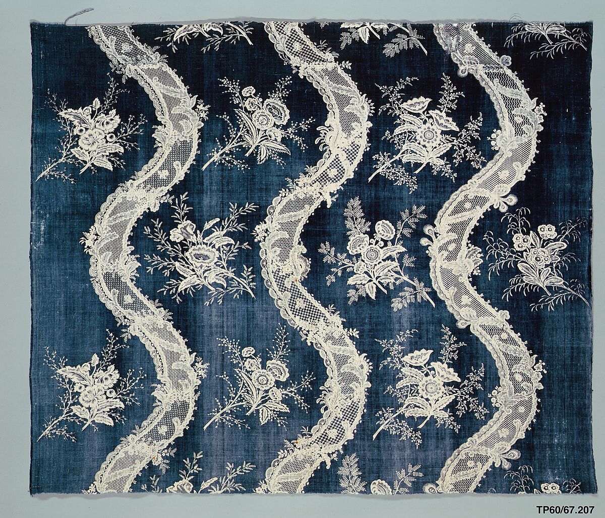 The design of this unusual printed cotton is actually recorded in a series of impressions on paper in a pattern book inscribed Fosters and Co., Bromley Hall, Middlesex, about 1780. The technique and width of this version suggest a date in the 1830s, after discharge printing had been invented.