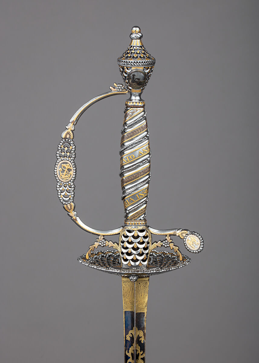 Admiral Marriot Arbuthnot (1711–1794) was presented with this sword by the residents of the English island of Jersey (Channel Islands) for having saved them from attack by the French fleet in 1779. A band wound around the grip bears a Latin inscription that reads in translation: "The Island of Jersey, delivered, presents this in gratitude, 1780." The urn-shaped pommel is an early example of what later became a characteristic feature of English Neoclassical hilts.