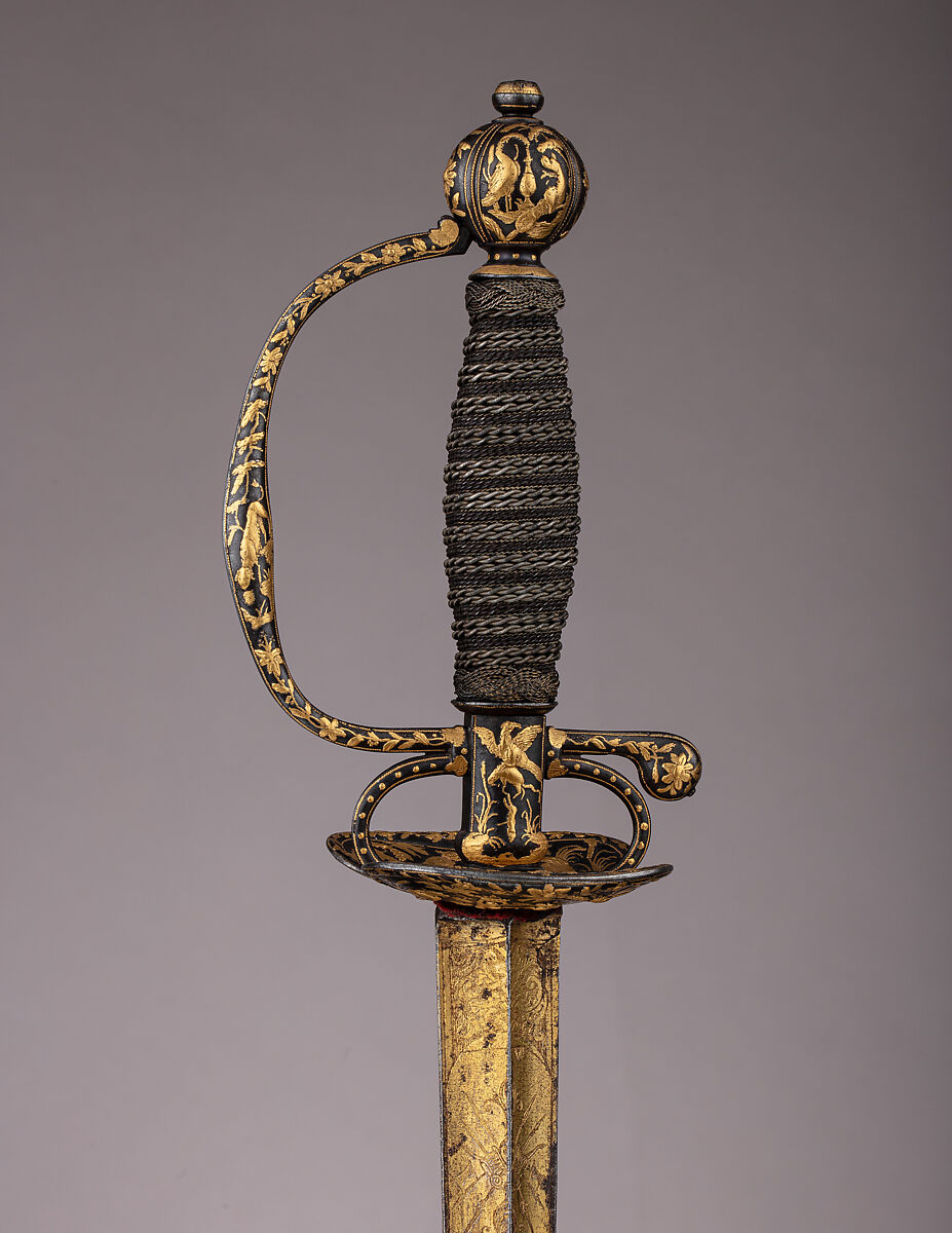 By the early seventeenth century, the rapier, a long slender thrusting sword, began to dominate as the gentleman’s weapon of choice. During the course of the century, however, as civilian fencing techniques became more specialized and refined, the rapier developed into a lighter, trimmed-down weapon known by about 1700 as the smallsword. Smallswords, often richly decorated, remained an integral part of a gentleman’s wardrobe until the wearing of swords in civilian settings went out of fashion at the end of the eighteenth century, at which time pistols were replacing swords as arms most frequently used in personal duels. The majority of smallsword hilts are made of silver or steel, but many also employ a wide variety of luxurious materials, such as gold, porcelain, and enamel. At their best, smallswords combine the crafts of swordsmith, cutler, and jeweler to create an elegant weapon that was also a wearable work of art.