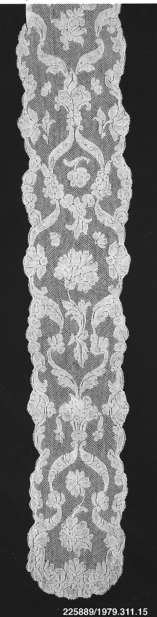 Among choice examples of the great lace types represented in Miss Newbold's small collection are: early Italian pieces combining cut-work, pulled work, reticella, embroidery on linen ground; Sicilian polychrome silk filet; seventeenthcentury Venetian points (point de Venise à reseau and the widely known rose point de Venise); famous French needlepoints (Point de Paris, Argentan, Alençon); French and Flemish bobbin laces (Binche, Valenciennes, Brussels, Point d'Angleterre, and Point de Gaz); and a beautiful cap crown of Argentella (1979.310.9), a rare eighteenth-century European lace whose place of origin has never been surely determined.