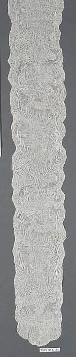 Among choice examples of the great lace types represented in Miss Newbold's small collection are: early Italian pieces combining cut-work, pulled work, reticella, embroidery on linen ground; Sicilian polychrome silk filet; seventeenthcentury Venetian points (point de Venise à reseau and the widely known rose point de Venise); famous French needlepoints (Point de Paris, Argentan, Alençon); French and Flemish bobbin laces (Binche, Valenciennes, Brussels, Point d'Angleterre, and Point de Gaz); and a beautiful cap crown of Argentella (1979.310.9), a rare eighteenth-century European lace whose place of origin has never been surely determined.