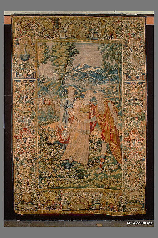 The story of Jacob as depicted in this set of six tapestries (1983.73.1–.6) begins with the scene of Esau selling his birthright to Jacob (Gen. 25:29–34). Esau, the hunter, sits with his bow and quiver at his feet. He clasps hands with Jacob, his brother, who is clad in the starred robe that will identify him throughout the story. By this handshake Esau and Jacob seal their agreement, and the former accepts a bowl of food in exchange for his birthright as firstborn. The secondary scenes represent different moments in time and serve to advance the story. In the center distance Esau is shown hunting with two dogs. To the right, Rebecca, mother of Esau and Jacob, is seen cooking outside the tent, probably preparing food for Jacob to present o his father, Isaac (Gen. 27).