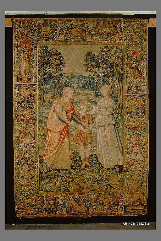 The story of Jacob as depicted in this set of six tapestries (1983.73.1–.6) begins with the scene of Esau selling his birthright to Jacob (Gen. 25:29–34). Esau, the hunter, sits with his bow and quiver at his feet. He clasps hands with Jacob, his brother, who is clad in the starred robe that will identify him throughout the story. By this handshake Esau and Jacob seal their agreement, and the former accepts a bowl of food in exchange for his birthright as firstborn. The secondary scenes represent different moments in time and serve to advance the story. In the center distance Esau is shown hunting with two dogs. To the right, Rebecca, mother of Esau and Jacob, is seen cooking outside the tent, probably preparing food for Jacob to present o his father, Isaac (Gen. 27).