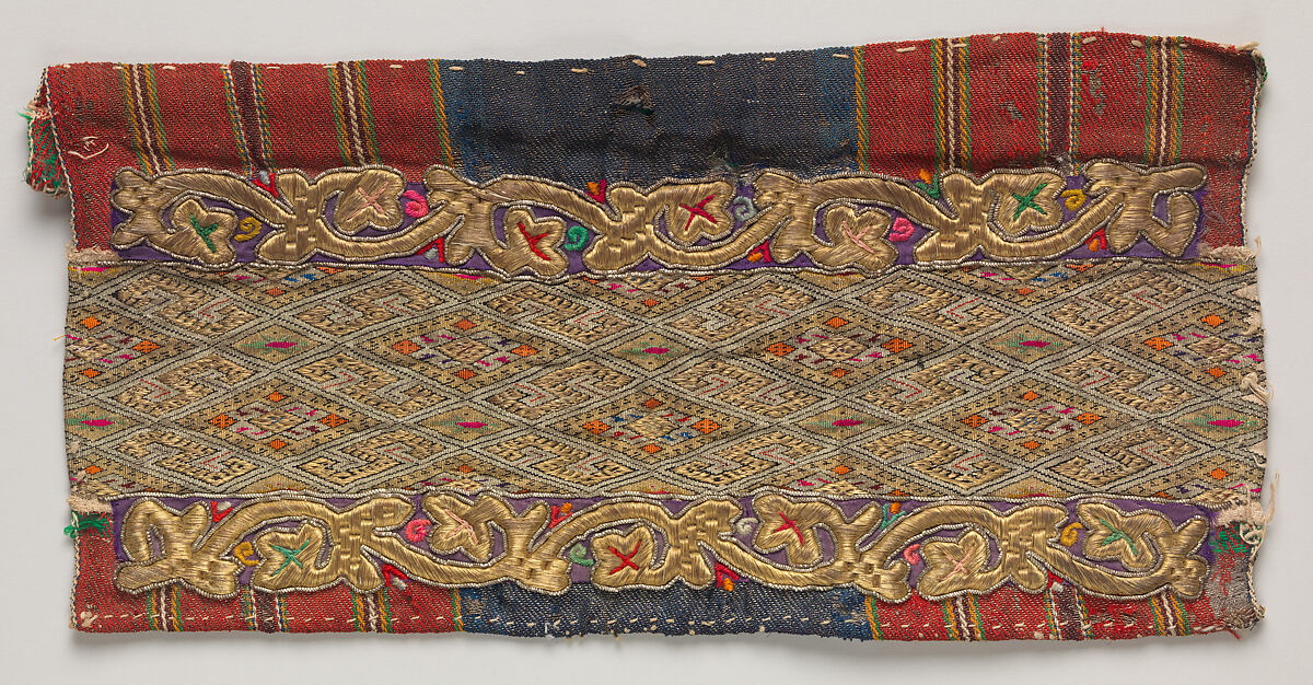 - Medium: Background: twill weave (warp: Turcana wool, Z spun, 24 per cm; weft: metal-wrapped thread; wool, Z spun, 14 per cm; cotton, 2Z spun, S plied); decorative panel: tapestry weave (warp: cotton, 2Z spun, S pliz, 16 per cm; weft: linen, Z spun, 38 per cm; silk, 2Z spun, S plied; metal-wrapped thread, 64 per cm); embroidery: metal-wrapped thread, metal coil