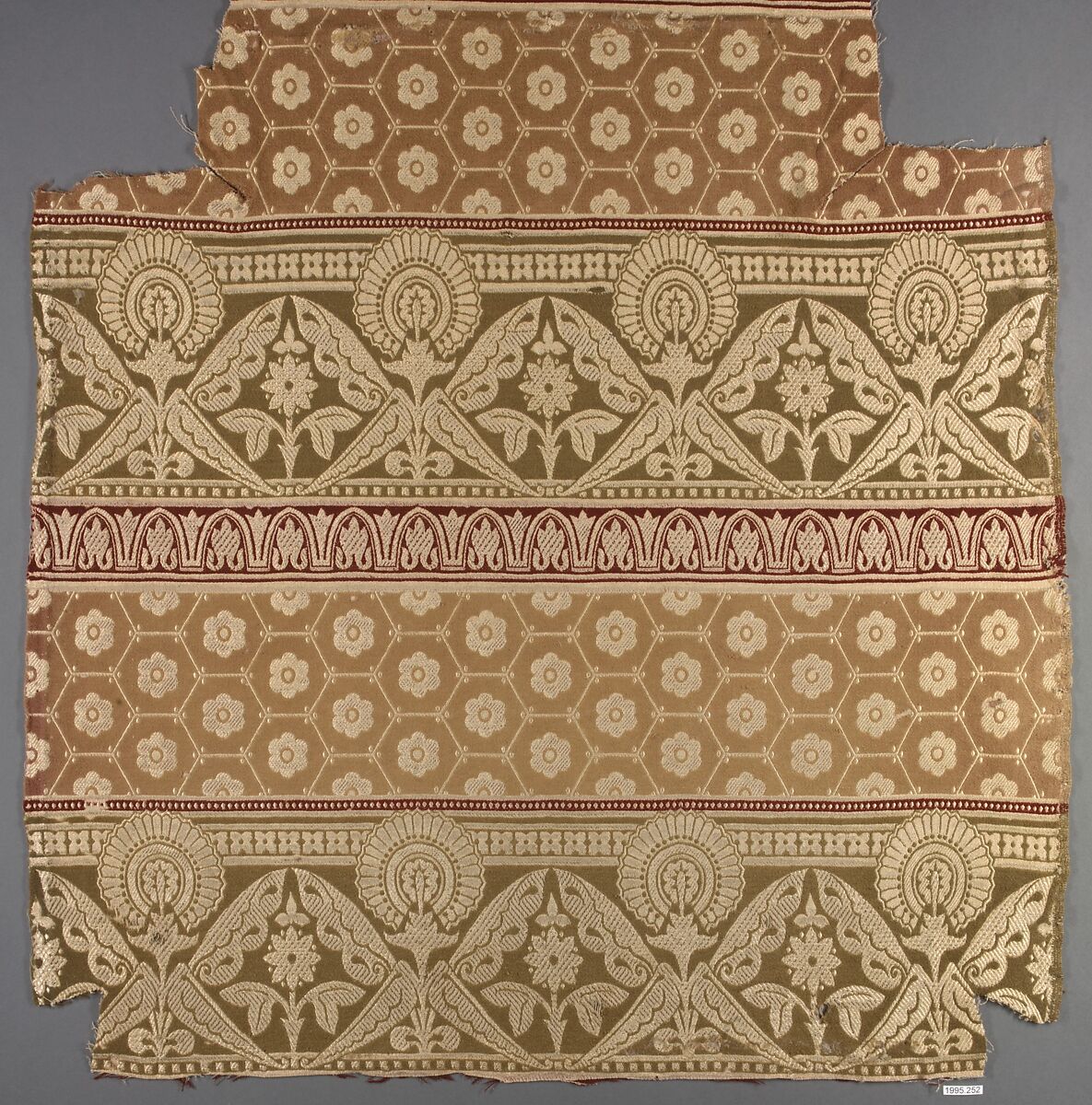 Christopher Dresser was one of the most innovative and influential English textile designers of the nineteenth century, but only a small number of textiles woven from his designs have been identified. This piece is of interest because the date of the design can be firmly documented as a variant color way of the same pattern was registered at the London Public Record Office on April 18, 1873.