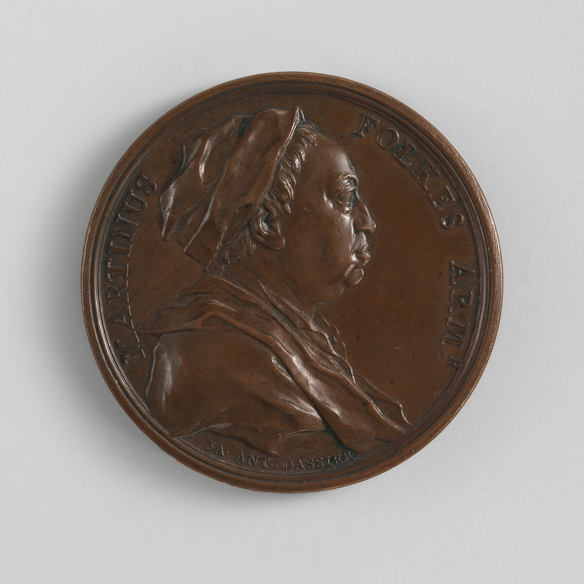 Dassier modeled the erudite Folkes (1690–1754), whose expertise included ancient coinage, as part of a medallic series of eminent British worthies.