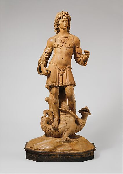 Florentine ceramic sculptors about 1500 successfully imbued their statuettes with the charm and solid compositional principles promoted by High Renaissance painters such as Fra Bartolommeo. They must have marketed them successfully as well. Anonymous modelers, later given monikers such as the "Master of the Unruly Children" and the "Master of the David and Saint John Statuettes," formed sizable studios from which poured a steady stream of terracottas with religious themes. Our archangel is one of the last-named master's largest and finest moments. Michael, in well-studied contrapposto, stands effortlessly triumphing over a dragon of comic-book mien. His daintily fashioned corselet bears the heads and wings of two seraphim in reference to his role in the sacred mysteries. He has lost his usual attributes, his sword and the scale pan in which he would have weighed the souls of the departed. They were no doubt made of gilt metal or wood.