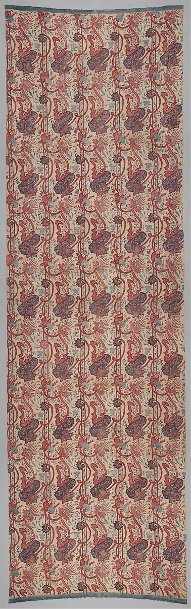 Crisp cotton curtains like this brought the brilliant colors of South Asia to upper-middle-class British, Dutch and French homes. Probably imported by the British East India Company, this Indian textile boasts a gloriously bold, decorative design, executed in the type of painted cotton cloth manufacturers in Britain and France tried for decades to emulate in vain. From the 1650s onwards, these "chintzes" (anglicizing chint, Hindi for "speckled") made for the European market were such sought-after commodities that Britain eventually criminalized their import in an attempt to protect local printed-cotton industries. The repeat pattern on this well-preserved example is so neatly and consistently represented that it is startling to realize that it was mostly applied freehand, painted on its white support in brilliant dyes by talented Indian kalamkaris (specialist painters).