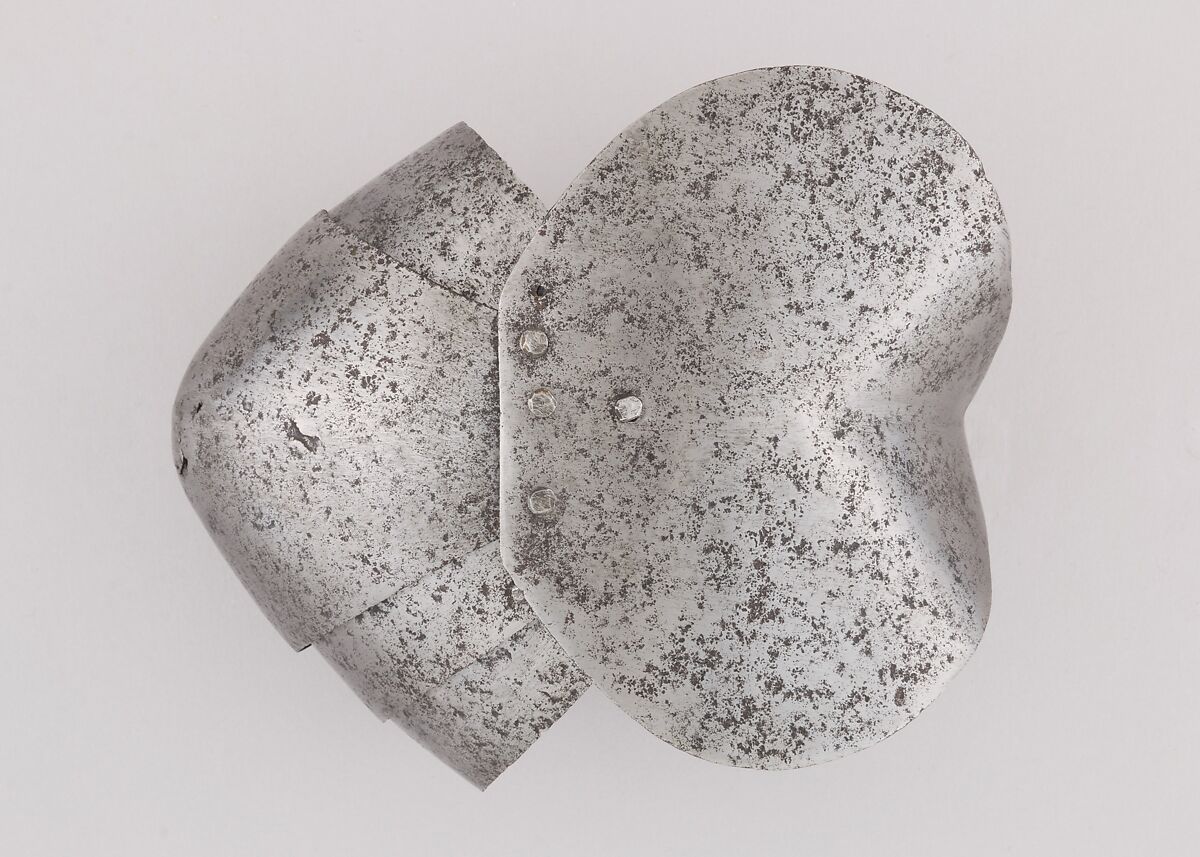 This is part of a large find of medieval armor discovered in 1840 in the ruins of the fortress of Chalcis, on the Greek island of Euboea (then a Venetian colony called Negroponte). The fortress had been captured and destroyed by the Turks in 1470. Now divided largely between the Ethnological Museum, Athens, and The Metropolitan Museum of Art, the Chalcis hoard contains many rare and unusual elements of fourteenth- and fifteenth-century armor. Of particular importance are the variety of headpieces and the many fragments of brigandines (armor for the torso constructed of small plates riveted to layers of fabric), some of which retain portions of their original velvet covering. The Chalcis armor provides a unique picture of the armament used in the Aegean, one of the easternmost military outposts of the Venetian empire.