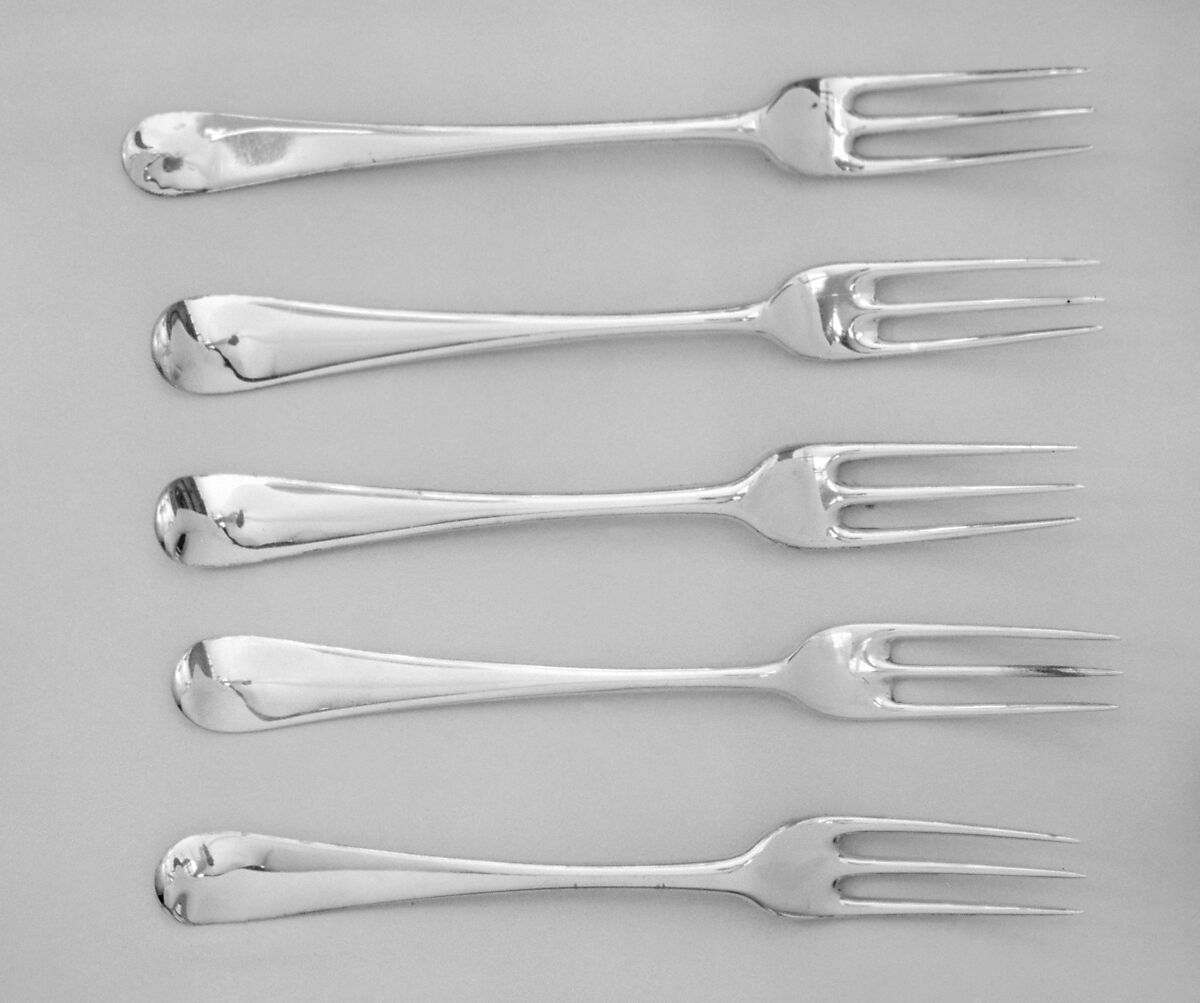 Forks—first two-pronged and then three-pronged—were introduced into England over the course of the seventeenth century. It was only in the eighteenth century that sets of forks became common.