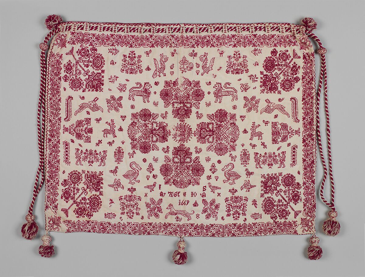 A fine example of English amateur embroidery of the late 1600s, this work bag bears the initials of the young needleworker who made it, who also added the date 1669, and her age, ten. The bag, which would have been used to store embroidery implements and supplies, is decorated on both front and back with red wool thread, primarily in a double running stitch, on a linen foundation.