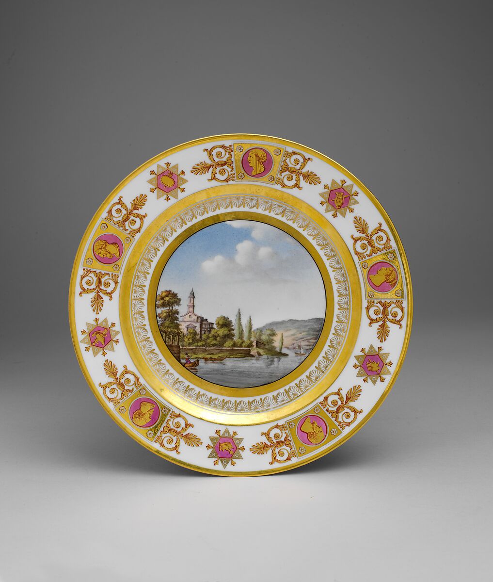 All of the plates in this service were decorated with views of Switzerland; this example illustrates the lake of Lugano. The service is notable for the use of transfer printing to establish the outlines of the landscape scenes, which were then painted with polychrome enamels. Transfer printing was seldom used at Sèvres, and it appears that this service was the first in which it was employed for the primary decoration rather than just for more minor decorative motifs.