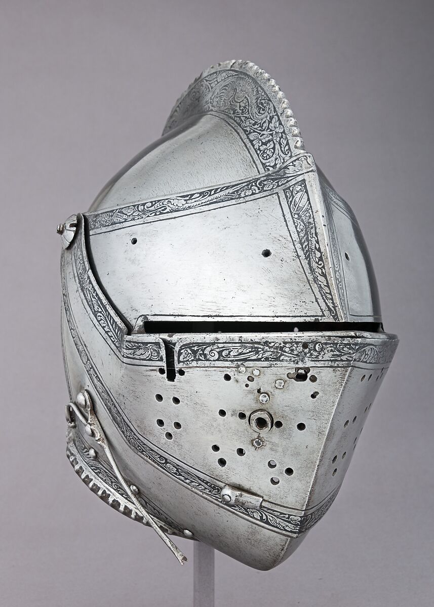 The ornament on the comb is copied from a design by the Augsburg printmaker and armor etcher Daniel Hopfer (ca. 1470–1536), whose published prints were very influential in the development of a recognizably Augsburg style of armor decoration, which was emulated in Innsbruck and elsewhere in Austria and South Germany.
