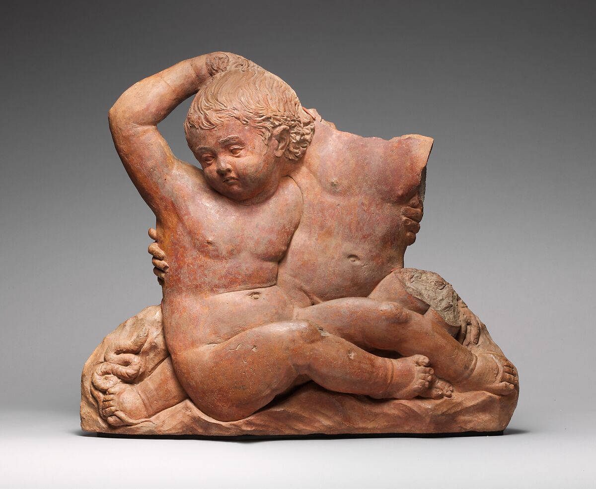 The style of this piece, with rounded shapes arranged as planes in subtly graded low relief, owes much to the presence in Padua of the great Florentine sculptor Donatello in the 1450s. On the basis of its similarity to the bronze panels of angels in the church of Sant'Antonio in Padua, the work has been attributed to Antonio di Chelino, who was an assistant on Donatello's sculptures for the high altar of the church, known as the Santo. But with or without an attribution, this is a highly sympathetic and plenteously Donatelesque work whose rare secular subject no doubt appealed to Pauda's Humanist culture.