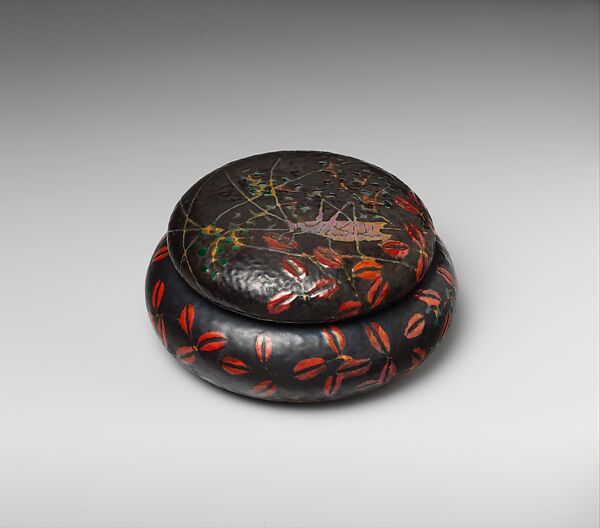 This object forms part of a group of glass vessels and enamel containers Louis Comfort Tiffany loaned to the Museum in 1925 that were later given to the Museum by the Tiffany Foundation in 1951 (51.121.1–.44). Tiffany originally chose this group of objects to show examples of form, technique, and color that were not represented in the 1896 Havemeyer gift (96.17.9–.56). The coloration and patterning of Japanese lacquer incense boxes may have inspired this piece. The dark, rich ground evokes black lacquer, and the red and gold raised enamel decoration of a grasshopper, clover, and grasses references Japanese motifs associated with autumn.