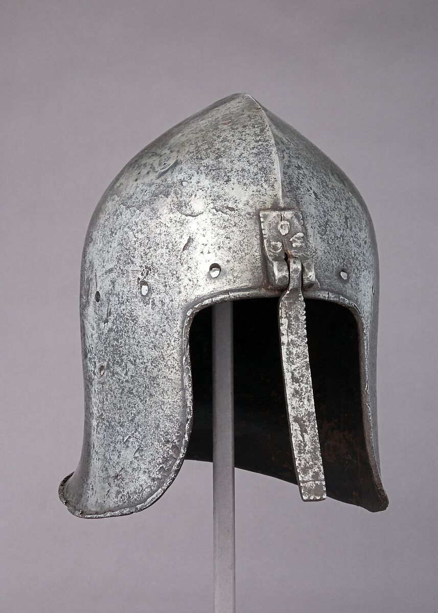 Barbutes with hinged nasals are recorded in Italian paintings and miniatures, but only two helmets with surviving nasals are known, both from Chalcis. The other example is in the National Historic Museum, Athens.