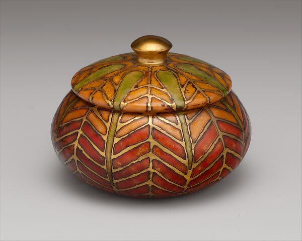 This object forms part of a group of glass vessels and enamel containers Louis Comfort Tiffany loaned to the Museum in 1925 that were later given to the Museum by the Tiffany Foundation in 1951 (51.121.1–.44). Tiffany originally chose this group of objects to show examples of form, technique, and color that were not represented in the 1896 Havemeyer gift (96.17.9–.56). A departure from Tiffany's typical enamelwork, this diminutive covered box features highly stylized leaf motifs in a limited palette that is more closely related to that of cloisonné.