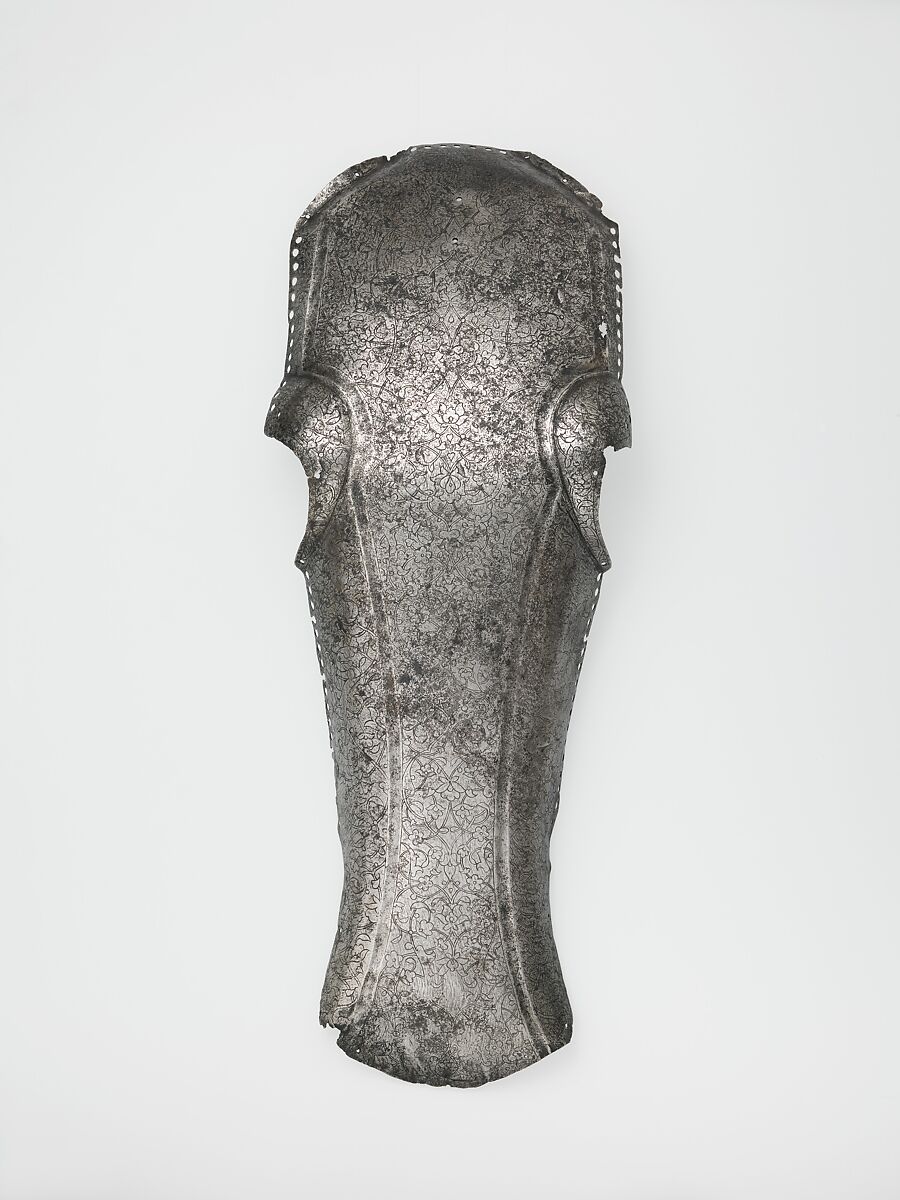 The surface is engraved with symmetrical floral arabesques. It is likely that this piece originally would have been part of an entire garniture for man and horse.