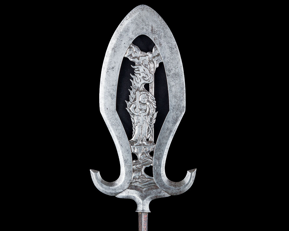 Large arrowheads, pierced and elaborately chiseled with landscapes, birds, flowers, dragons, and Buddhist divinities, were created to be admired for the beauty of their metalwork and design rather than for use in archery. The Metropolitan Museum's collection includes a group of more than thirty similarly signed and dated pieces (including acc. nos. 32.75.321, .327, .330, .334, .337, .339–.340, .398–.399, .403, .406, .409) that may have been made for presentation or as a votive offering to a shrine. This arrowhead, depicting the Buddhist deity Fudō Myō-ō, is by Umetada Yoshinobu, a member of the Umetada school of swordsmiths, tsuba makers, and iron chiselers.