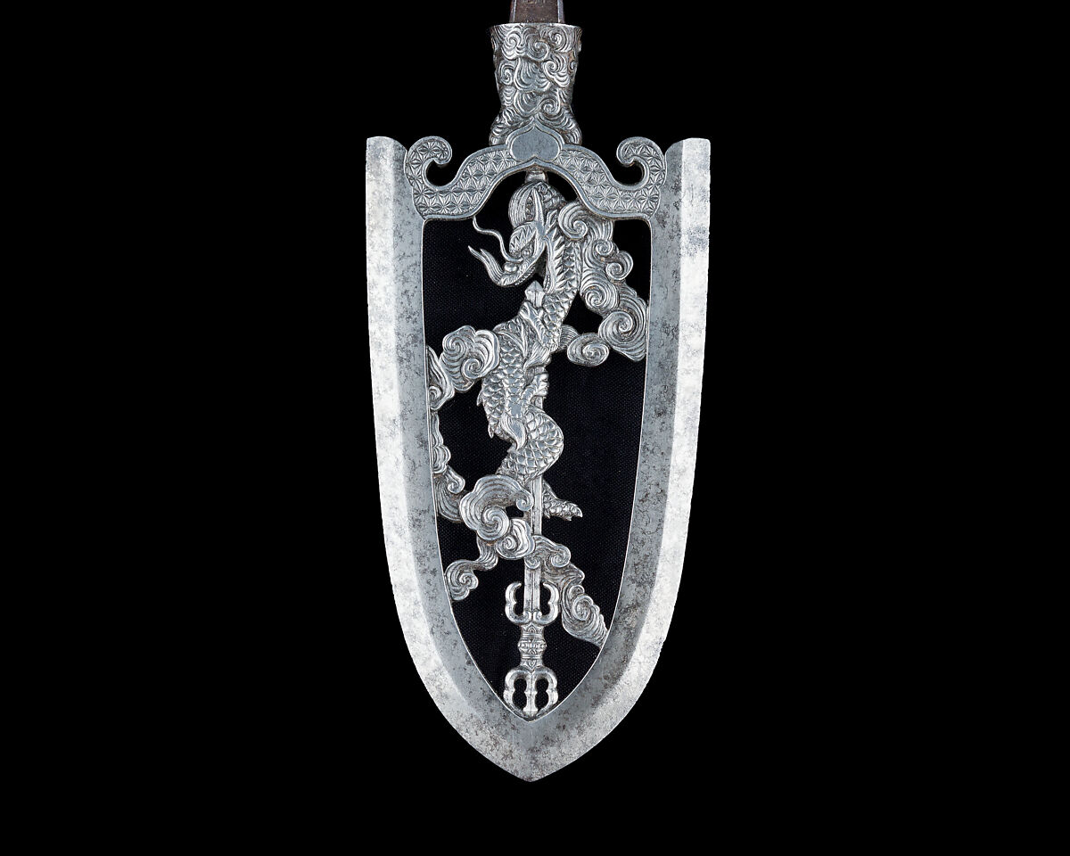 Large arrowheads, pierced and elaborately chiseled with landscapes, birds, flowers, dragons, and Buddhist divinities, were created to be admired for the beauty of their metalwork and design rather than for use in archery. This arrowhead is dated 1645 and signed by Umetada Motoshige (died 1675), a member of the Umetada school of swordsmiths, tsuba makers, and iron chiselers. It belongs to a group of more than thirty similarly signed and dated pieces in the Metropolitan Museum's collection (including acc. nos. 32.75.318, .327, .330, .334, .337, .339–.340, .398–.399, .403, .406, .409) that may have been made for presentation or as a votive offering to a shrine. The symbol on this arrowhead is that of the Buddhist deity Kurikara (or Fudō Myō-ō): a double-edged blade (ken) entwined with a dragon.