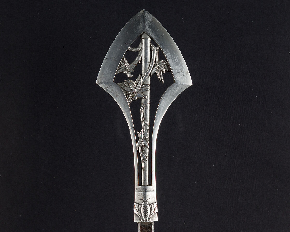Large arrowheads, pierced and elaborately chiseled with landscapes, birds, flowers, dragons, and Buddhist divinities, were created to be admired for the beauty of their metalwork and design rather than for use in archery. This arrowhead is dated 1645 and signed by Umetada Motoshige (died 1675), a member of the Umetada school of swordsmiths, tsuba makers, and iron chiselers. It belongs to a group of more than thirty similarly signed and dated pieces in the Metropolitan Museum's collection (including acc. nos. 32.75.318, .321, .327, .330, .334, .337, .339, .398–.399, .403, .406, .409) that may have been made for presentation or as a votive offering to a shrine.