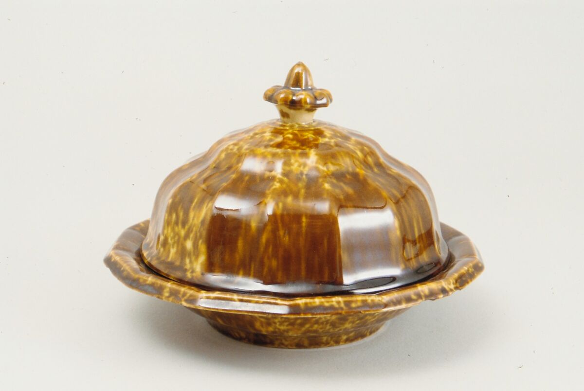 This covered butter dish with drain is made of a yellow clay body covered with a mottled-brown "Rockingham" glaze.