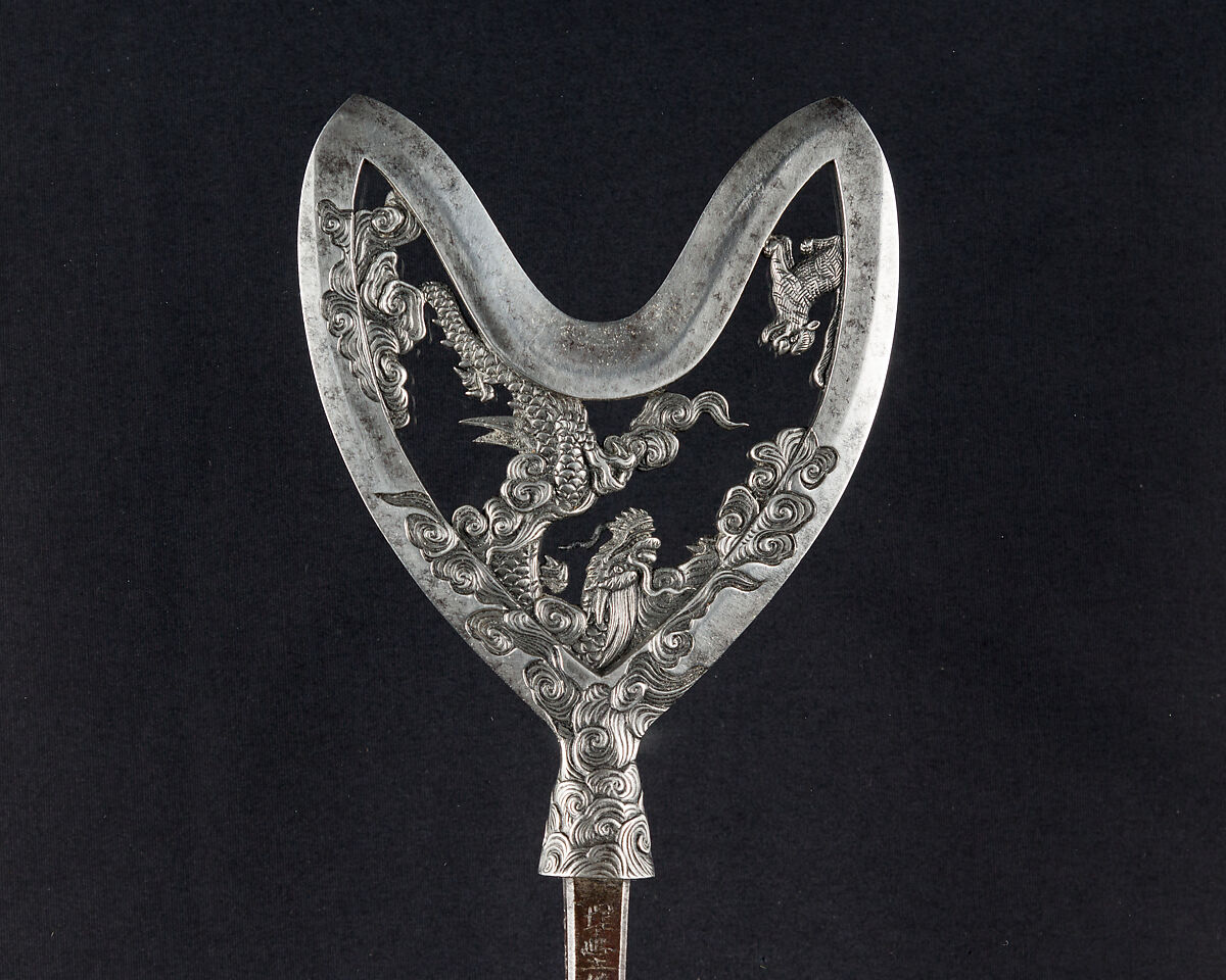 Large arrowheads, pierced and elaborately chiseled with landscapes, birds, flowers, dragons, and Buddhist divinities, were created to be admired for the beauty of their metalwork and design rather than for use in archery. This arrowhead is dated 1645 and signed by Umetada Motoshige (died 1675), a member of the Umetada school of swordsmiths, tsuba makers, and iron chiselers. It belongs to a group of more than thirty similarly signed and dated pieces in the Metropolitan Museum's collection (including acc. nos. 32.75.318, .321, .327, .330, .334, .337, .339–.340, .398, .403, .406, .409) that may have been made for presentation or as a votive offering to a shrine.