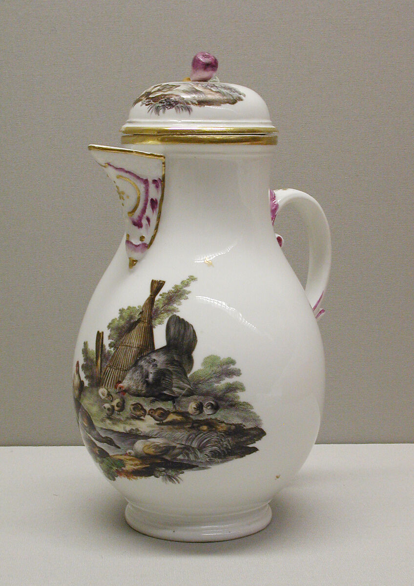 This partial tea and coffee service is distinguished by its relative completeness and its two components (the coffee pot and the hot milk jug) signed by the painters who decorated them—Joseph Angele and Johann Heinrich Usinger, respectively—a rarity on 18th-century porcelain.
