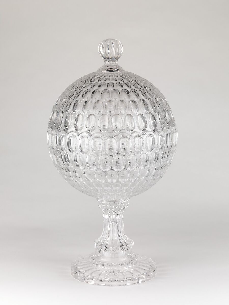 One of the earliest patterns used in the Pittsburgh area, “Argus,” also known as “Thumbprint,” is a deliberate imitation of cut glass. The concave oval facets create a highly reflective surface and a dramatic optical effect. The rims of the cover and the bowl are scalloped to fit seamlessly together and form a perfect sphere.