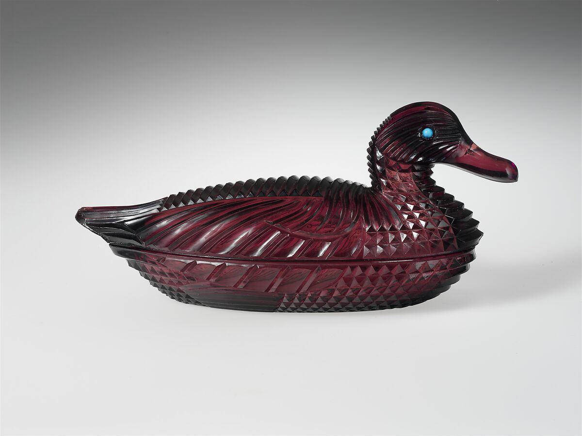 Although this duck-shaped dish has no mark, identical pieces have been found marked with a patent date of March 15, 1887, the date on which Patent No. 17192 was granted to T. B. Atterbury for this design. This dish has been extensively and cleverly reproduced in the twentieth century. The present example came into the collection of Emily Winthrop Miles before the design was reproduced. This dish is identical in form, though not in color, to another in the collection, 46.140.282.