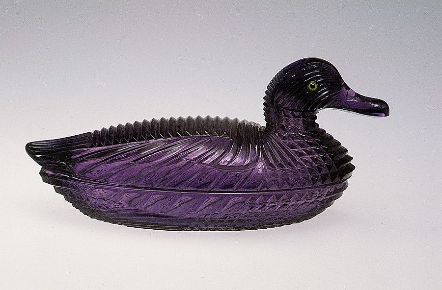 Although this duck-shaped dish has no mark, identical pieces have been found marked with a patent date of March 15, 1887, the date on which Patent No. 17192 was granted to T. B. Atterbury for this design. This dish has been extensively and cleverly reproduced in the twentieth century. The present example came into the collection of Emily Winthrop Miles before the design was reproduced. This dish is identical in form, though not in color, to another in the collection, 46.140.281.
